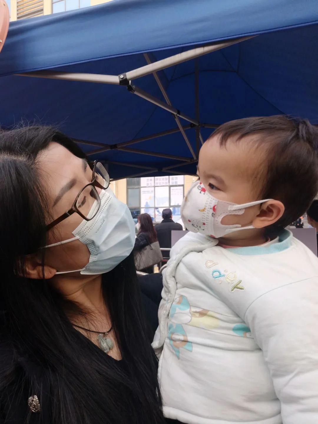 ▲在五和社区核酸采样点,张秀娟化身“临时妈妈”帮忙带娃