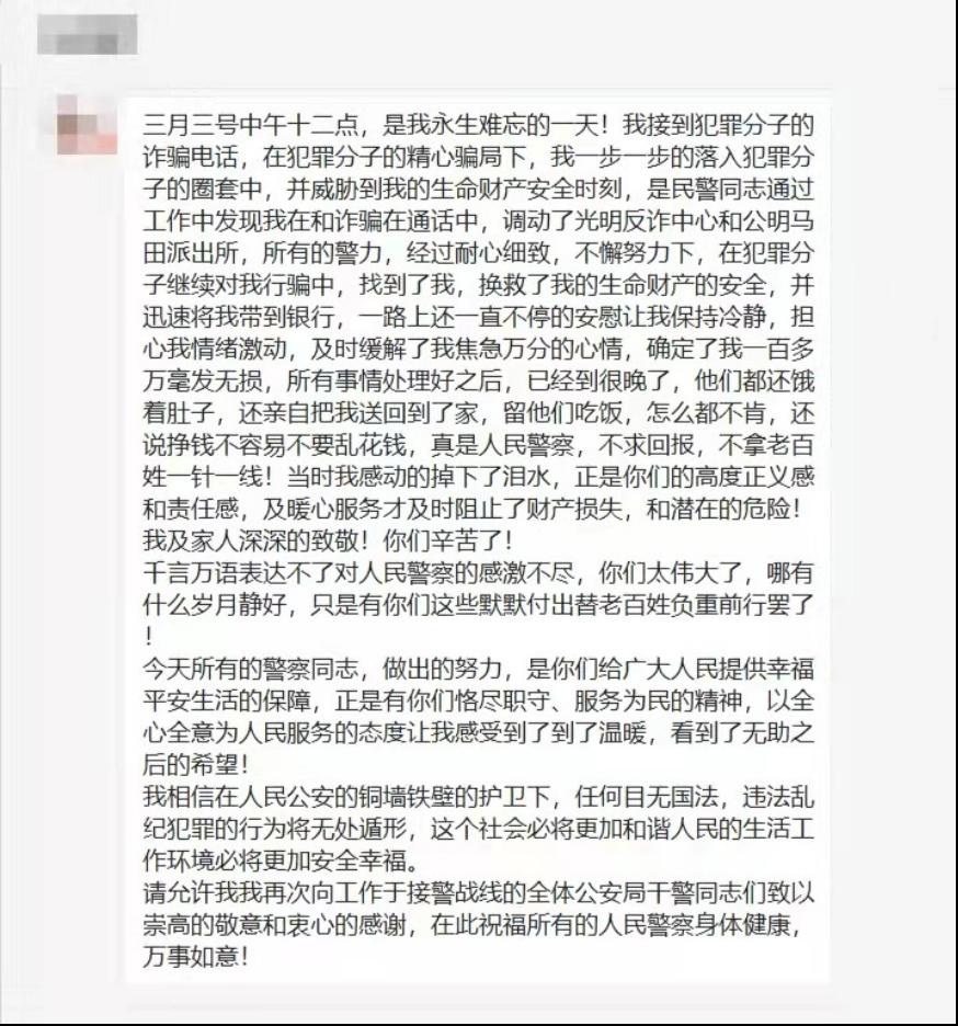 为表达感激之情,3月4日下午,方女士特地给深圳警方发来一段数百字的感谢信息。在信息里她说道:“千言万语也表达不了我对人民警察的感激不尽,你们太伟大了,哪有什么岁月静好,只是有你们在默默付出,替老百姓负重前行……”
