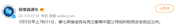 3月9日早上7时31分,第七架接返自乌克兰撤离中国公民临时航班安全抵达兰州。