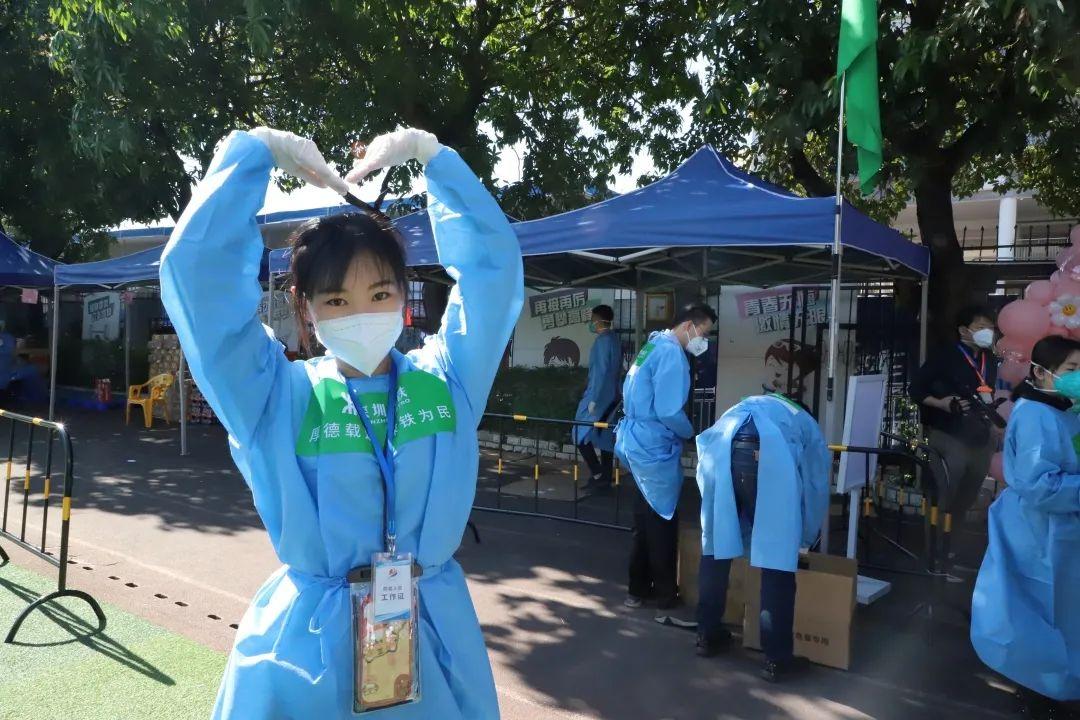 核酸检测点,来自深铁置业的叶仟千、姚婷婷柔声做好引导和提醒;