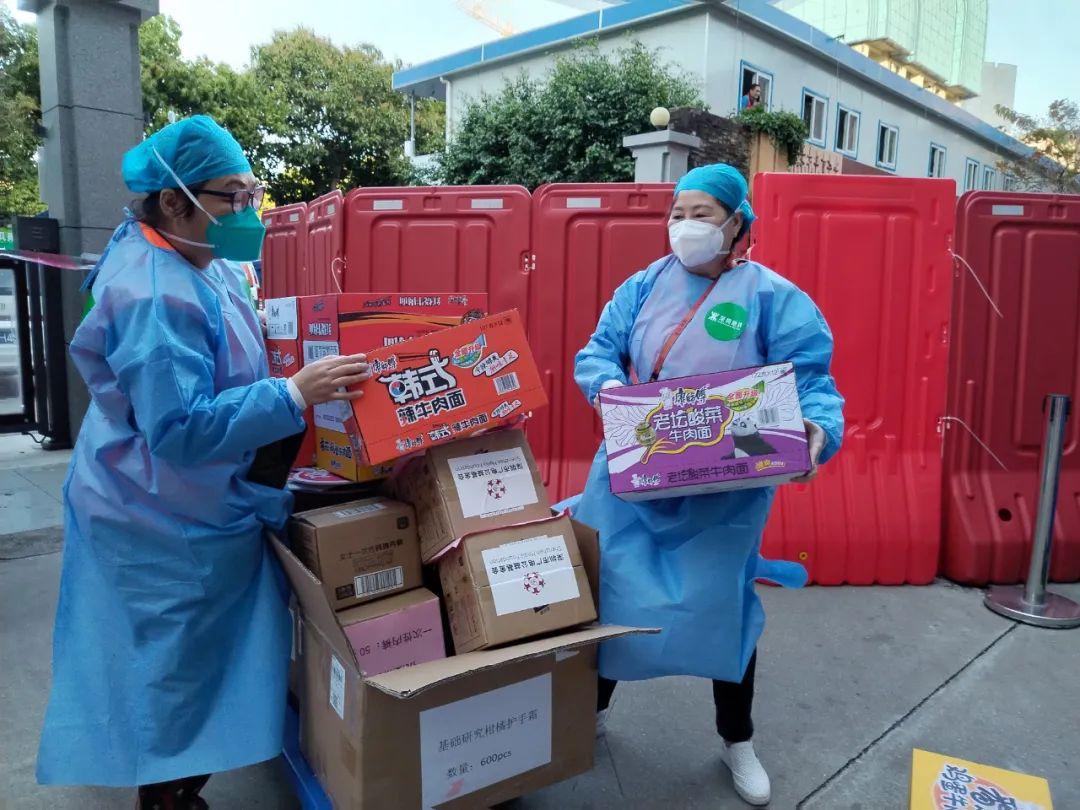 居民楼里,来自深铁投的胡旖雯用微笑送上生活物资;