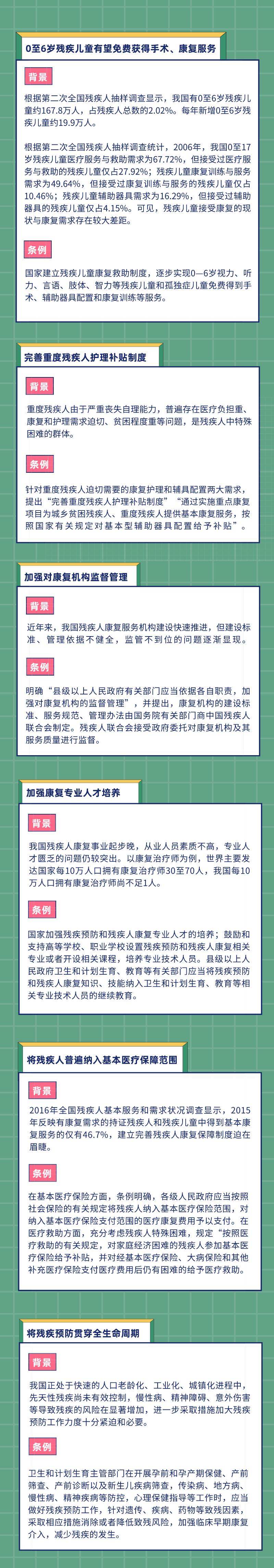 此次制定《条例》,就是为了从制度层面推动解决上述问题,促进我国残疾预防和残疾人康复事业持续健康发展。《条例》共6章36条。
