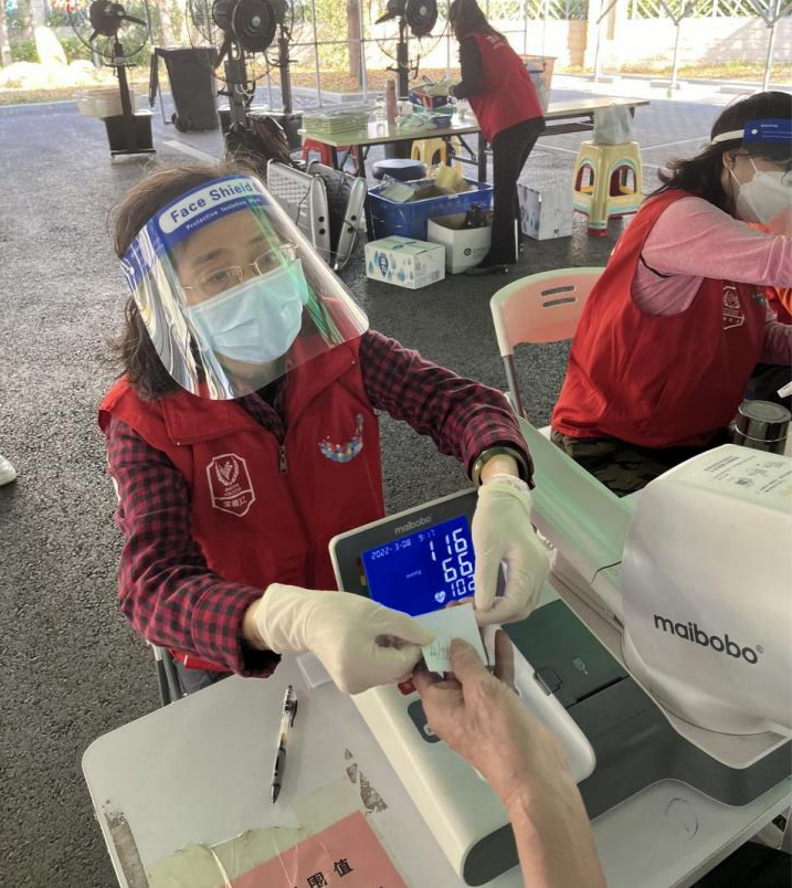 “在志愿服务中帮助大家,我很满足,也很高兴。”吴端娥欣喜自豪地向记者介绍道,她日常的工作主要是为接种疫苗的市民群众测量血压,当一些年长者因紧张引起血压较高时,她有自己的“小窍门”:让对方闭上眼睛,平复心情。“只要他们不看到那蹭蹭向上的数字,便能逐渐放松,让血压数值降下来。