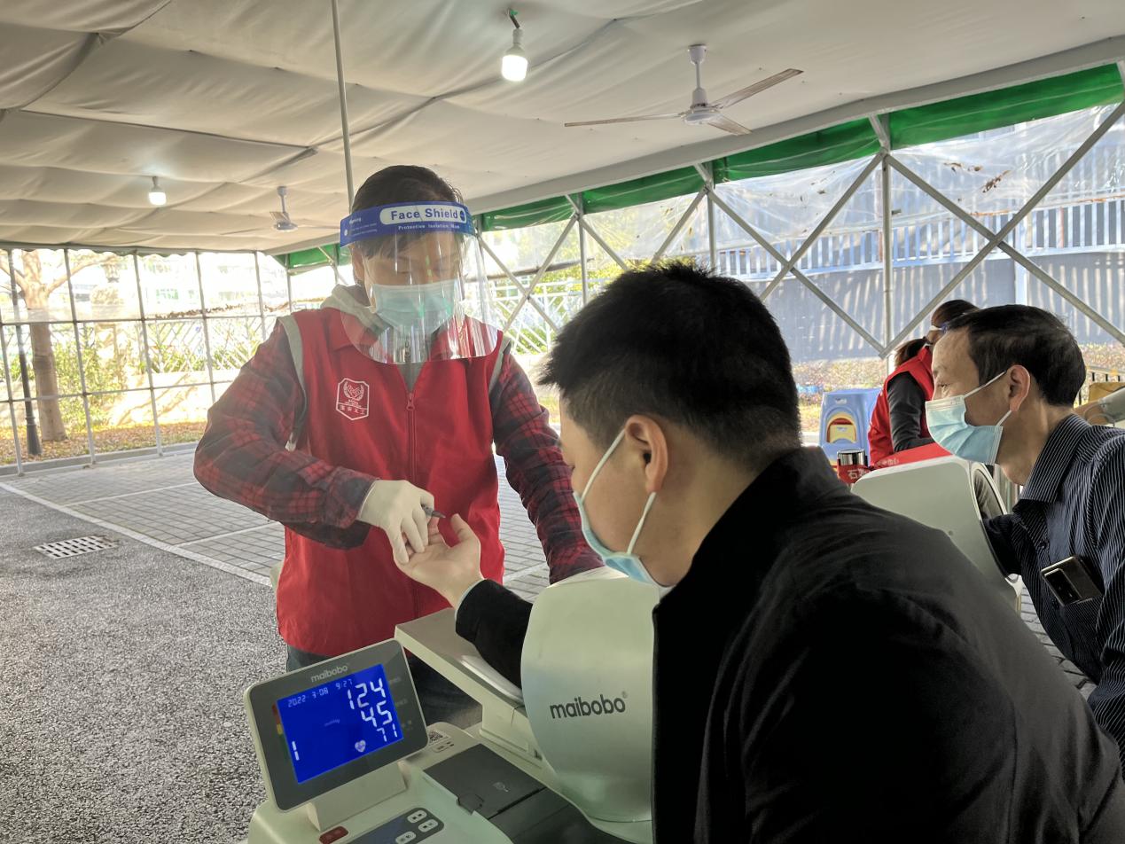 石岩文化艺术中心疫苗接种点处志愿者们为市民测量血压。
