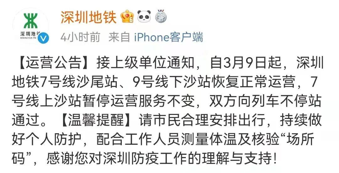 深圳地铁发布运营公告:自3月9日起,深圳地铁7号线沙尾站、9号线下沙站恢复正常运营,7号线上沙站暂停运营服务不变,双方向列车不停站通过。