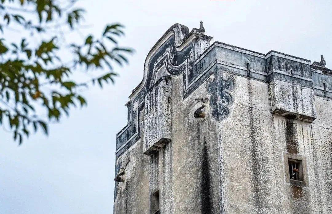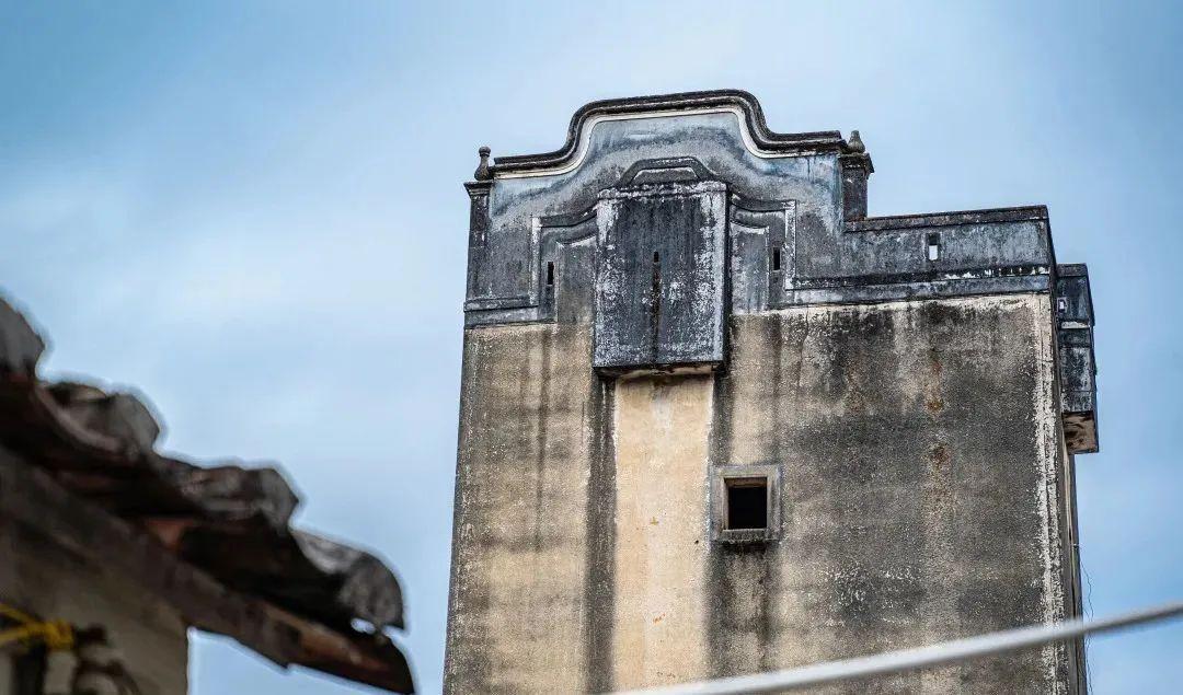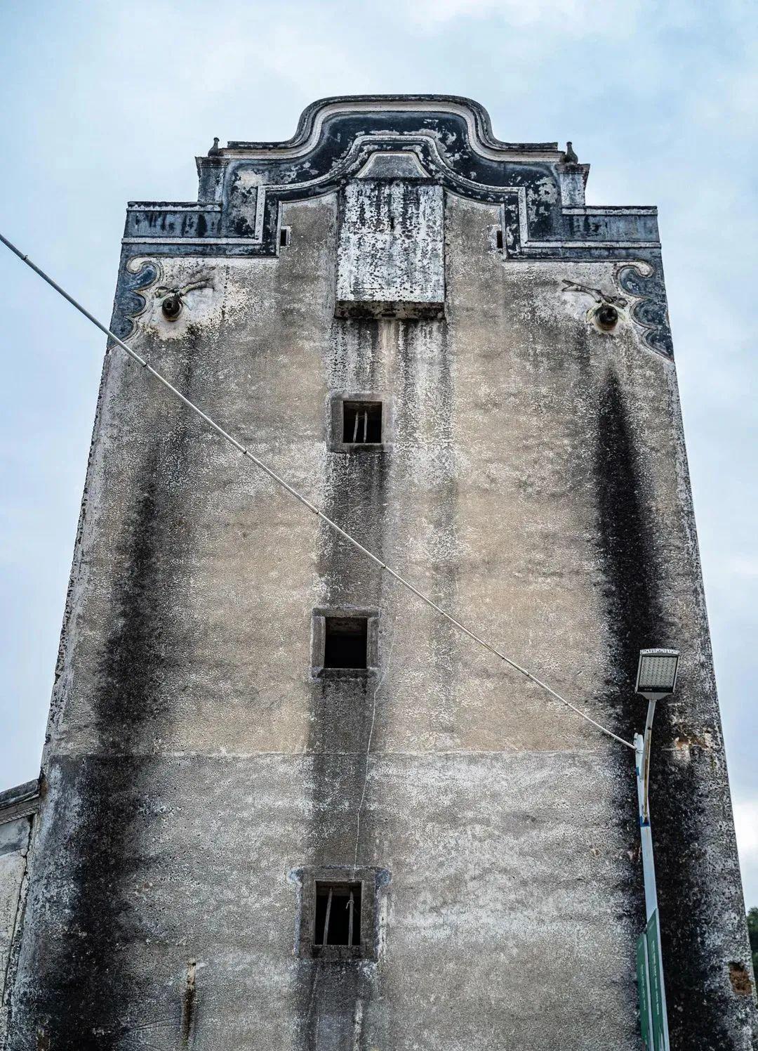看得出外墙原先是白色,历经百年时光的侵蚀,碉楼如今墙体斑驳、门窗锈渍重重,历史的沉淀感愈加浓郁。周身布满战争的印迹,也成了古村一道独特的景点。