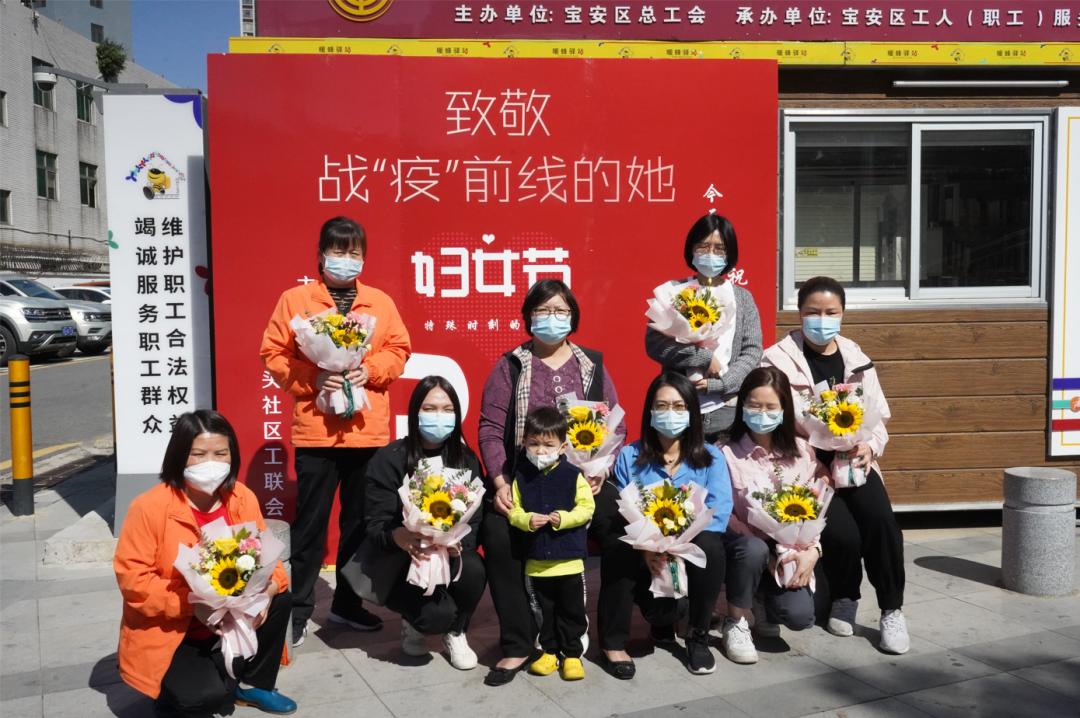 3月8日上午,正在松岗街道碧头社区防疫卡口执勤的女工作人员收到了一束漂亮的鲜花和祝福。这是碧头社区工联会对坚守一线防疫岗位的女职工举行的慰问活动,把“娘家人”的关怀和温暖送到女职工心坎上。