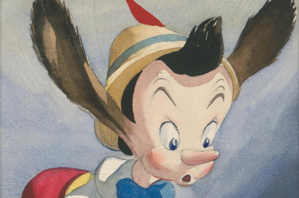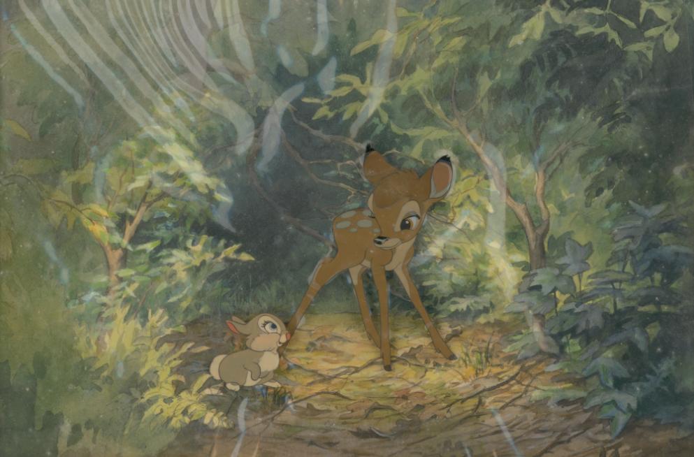 《白雪公主和七个小矮人》1937年改编自格林兄弟所写的童话故事。这张画稿是当年非常典型的制作动画的风格。在暗灰色背景板的衬托下,白雪公主和小动物的互动非常生动突出。