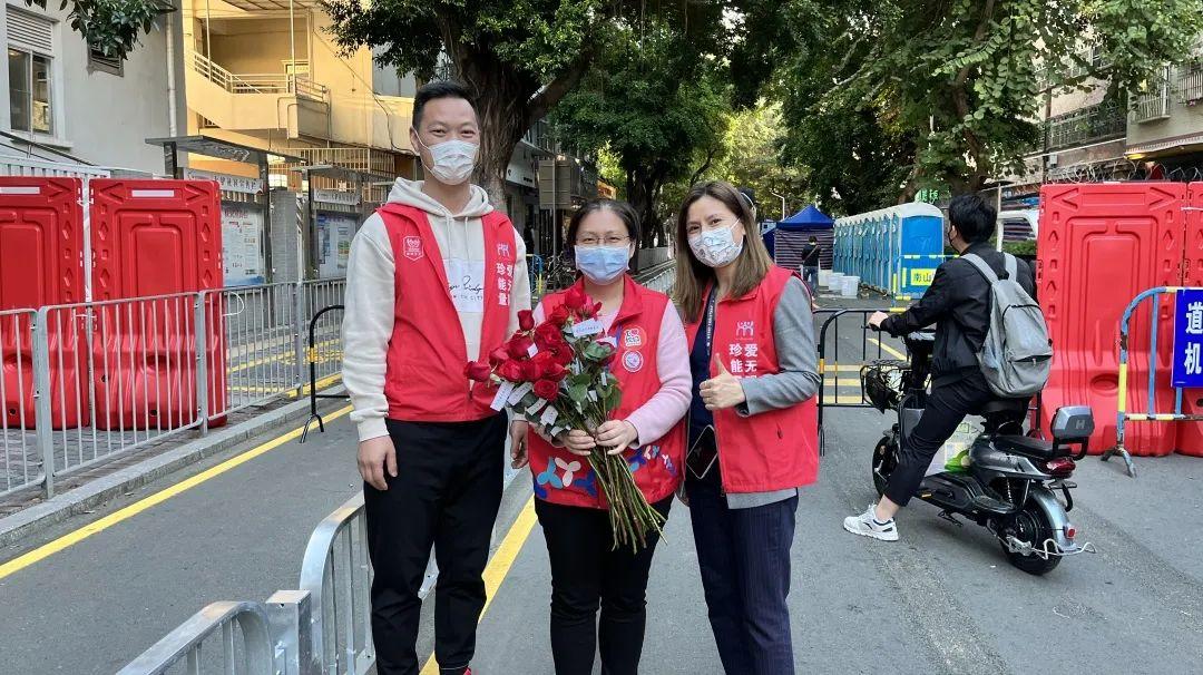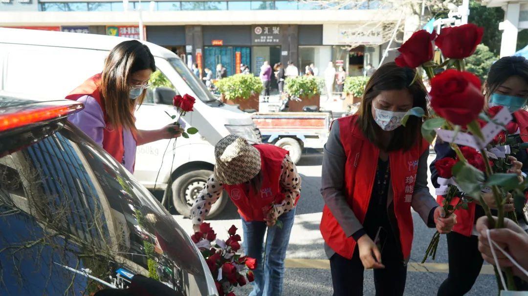 活动现场,珍爱义工队成员将一束束事先写有治愈话语的玫瑰花分发给前来核酸检测的市民,让他们将这些收到的玫瑰花赠送给在场的医护工作人员,“绕过江山错落才发现你,是人间星火”“耐心熬过所有的苦,就会遇见全部的好”玫瑰花上一句句感人肺腑的话语,温暖了社区一线抗疫工作者的心,也消除了他们连日来的疲惫。