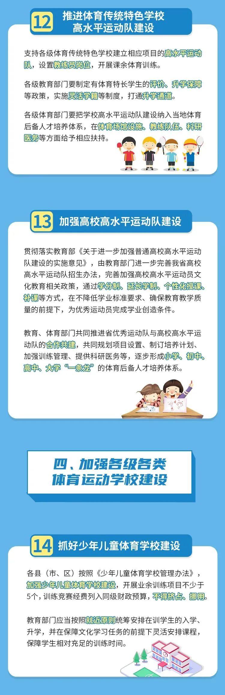 各级教育部门要制定有体育特长学生的评价、升学保障等政策,实施灵活学籍等制度,打通升学通道。各级体育部门要把学校高水平运动队建设纳入当地体育后备人才培养体系,在体育场馆设施、教练队伍、科研医务等方面给予相应扶持。