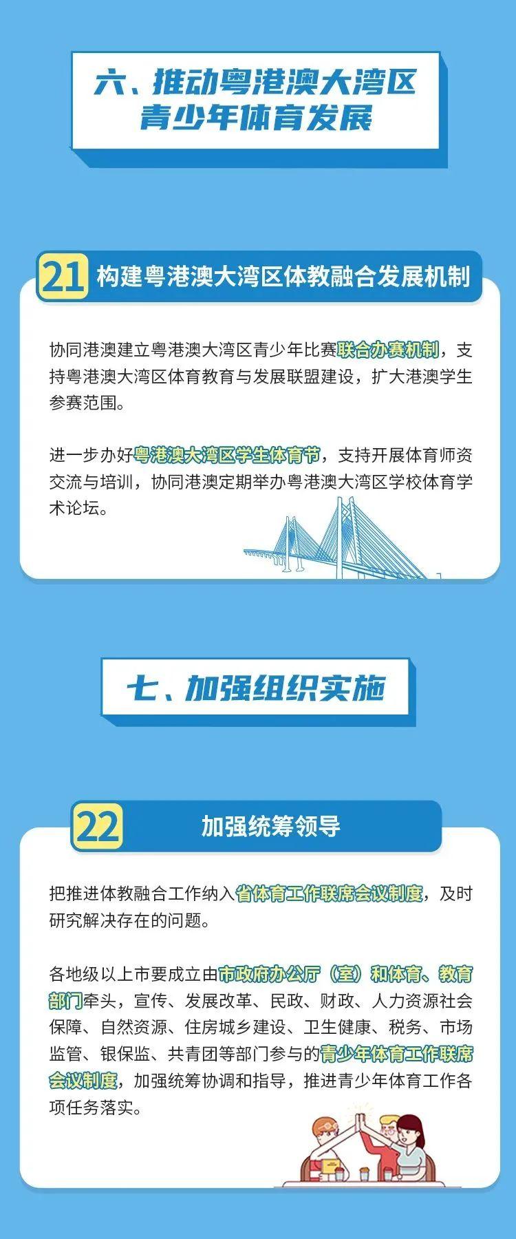 《意见》从加强学校体育工作、完善青少年体育赛事体系、加强学校青少年体育训练、加强各级各类体育运动学校建设、规范发展社会体育组织、推动粤港澳大湾区青少年体育发展、加强组织实施这7个方面,提出了体教融合的具体任务和要求。