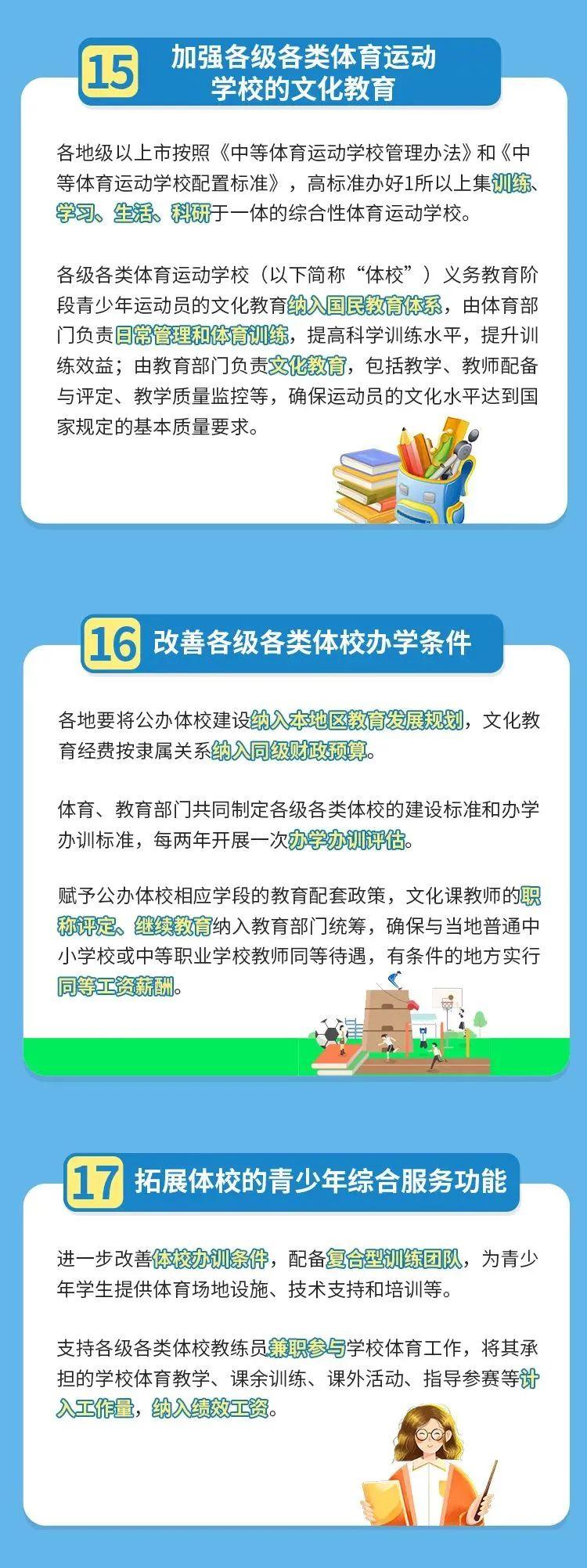 根据《意见》,各地级以上市要高标准办好1所以上集训练、学习、生活、科研于一体的综合性体育运动学校。