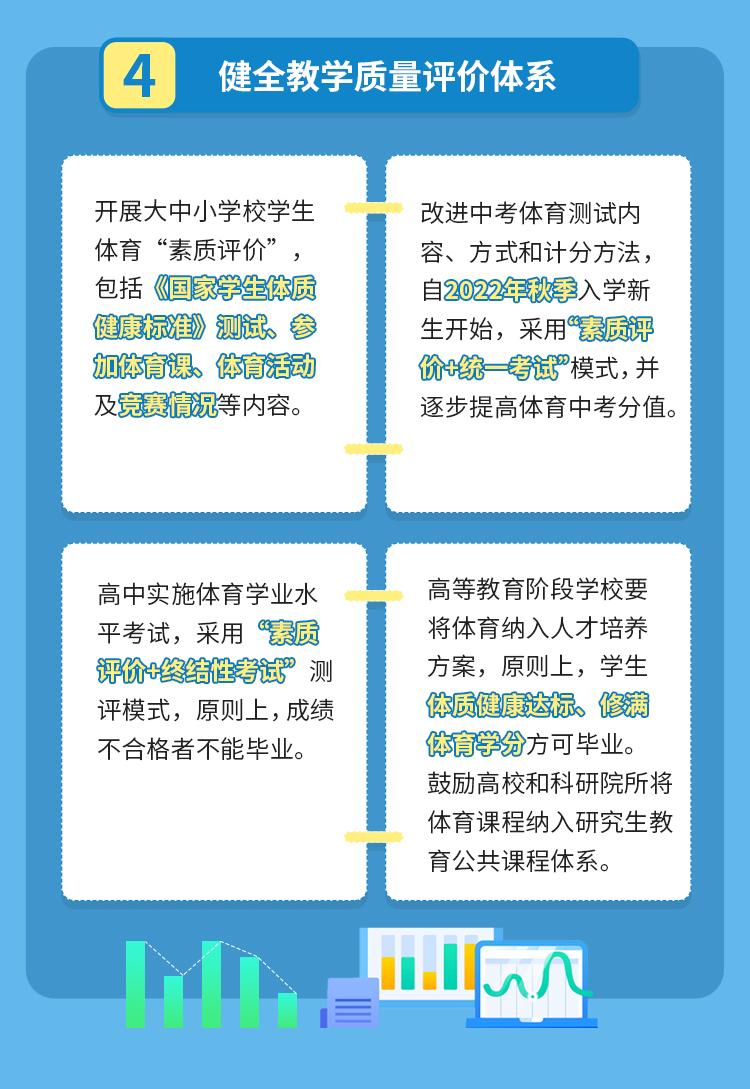 《意见》提出,中小学每天上午安排不少于30分钟的大课间体育活动。鼓励中小学每天开设一节体育课,当天没有体育课的,下午安排不少于40分钟的课外体育锻炼。自2022年秋季入学新生开始,采用“素质评价+统一考试”模式,并逐步提高体育中考分值。