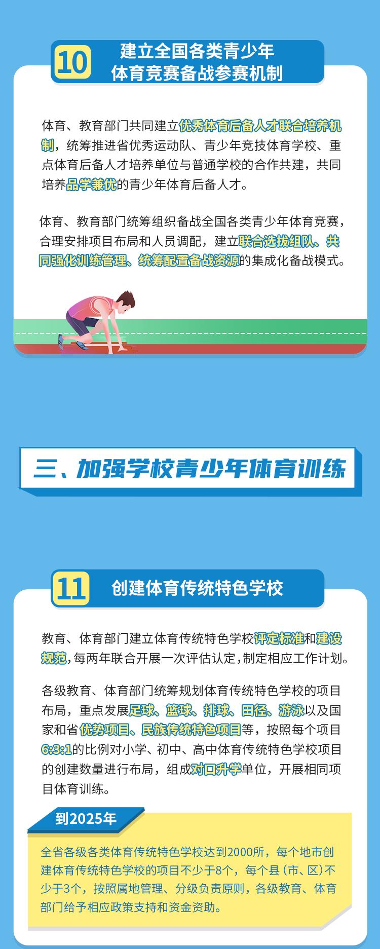 《意见》提出,要创建体育传统特色学校,各级教育、体育部门统筹规划体育传统特色学校的项目布局,重点发展足球、篮球、排球、田径、游泳以及国家和省优势项目、民族传统特色项目等,按照每个项目6:3:1的比例对小学、初中、高中体育传统特色学校项目的创建数量进行布局,组成对口升学单位,开展相同项目体育训练。