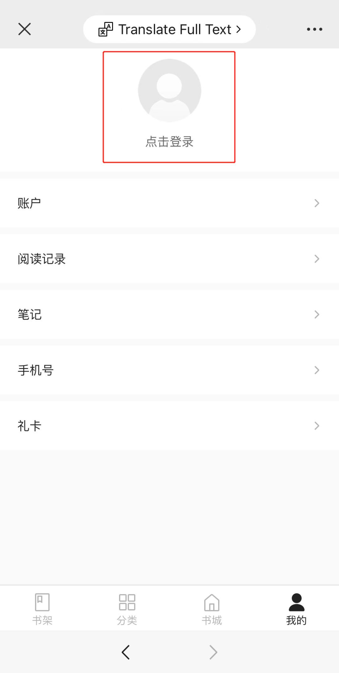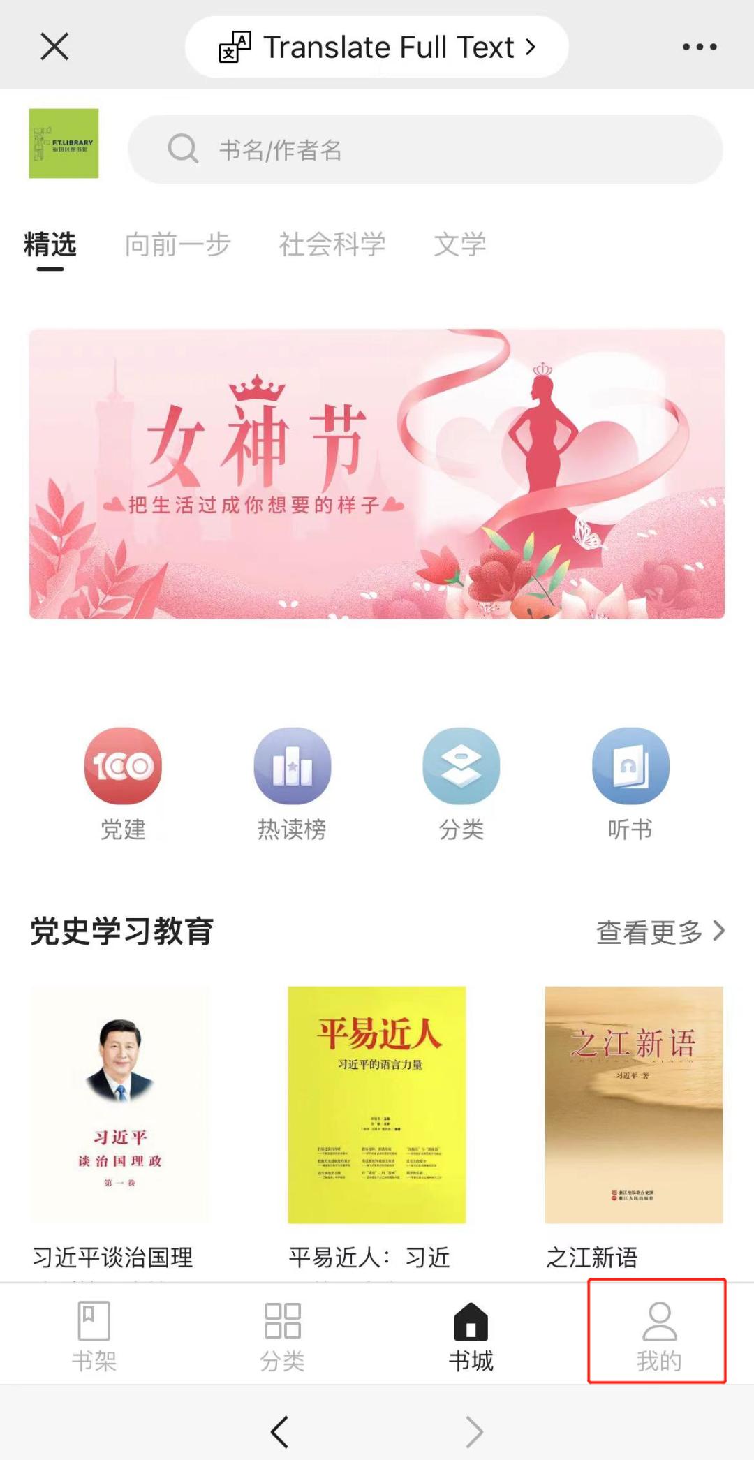 通过微信扫描书单中的二维码,通过书籍详情页右上方标志回到书城主页,并点击书城主页的右下角“我的”;