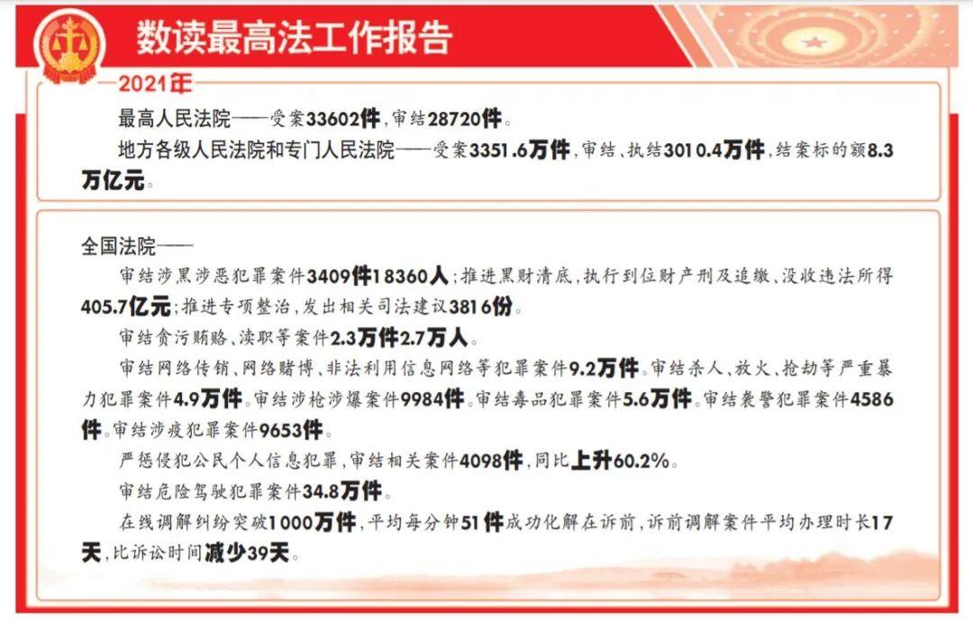 过去一年,司法前行的印记更加清晰,法治中国的脚步更加坚毅,报告中的一个个案例,传递了鲜明的价值导向,让法律条文走进千家万户。报告中的一串串数据,勾勒出平安中国、法治中国建设新成效:2021年,最高人民法院受理案件33602件,审结28720件,制定司法解释24件,发布指导性案例31个;地方各级人民法院和专门人民法院受理案件3351.6万件,审结、执结3010.4万件,结案标的额8.3万亿元,助推实现国家安全、社会安定、人民安宁。