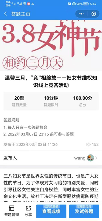 为引导社区女性学习妇女维权知识,进一步做好妇女维权宣传教育工作,提高妇女群众依法维权的意识和能力,引导妇女群众树立自信自强、向上向善的积极心态,田心社区开展了线上妇女维权知识竞赛,本次知识竞赛包含了妇女节缘起和妇女维权两大块的知识内容,吸引了95名社区女性参与答题。以知识竞赛的形式进行普法宣传,提升妇女法制安全意识,营造尊重妇女的良好社会环境。