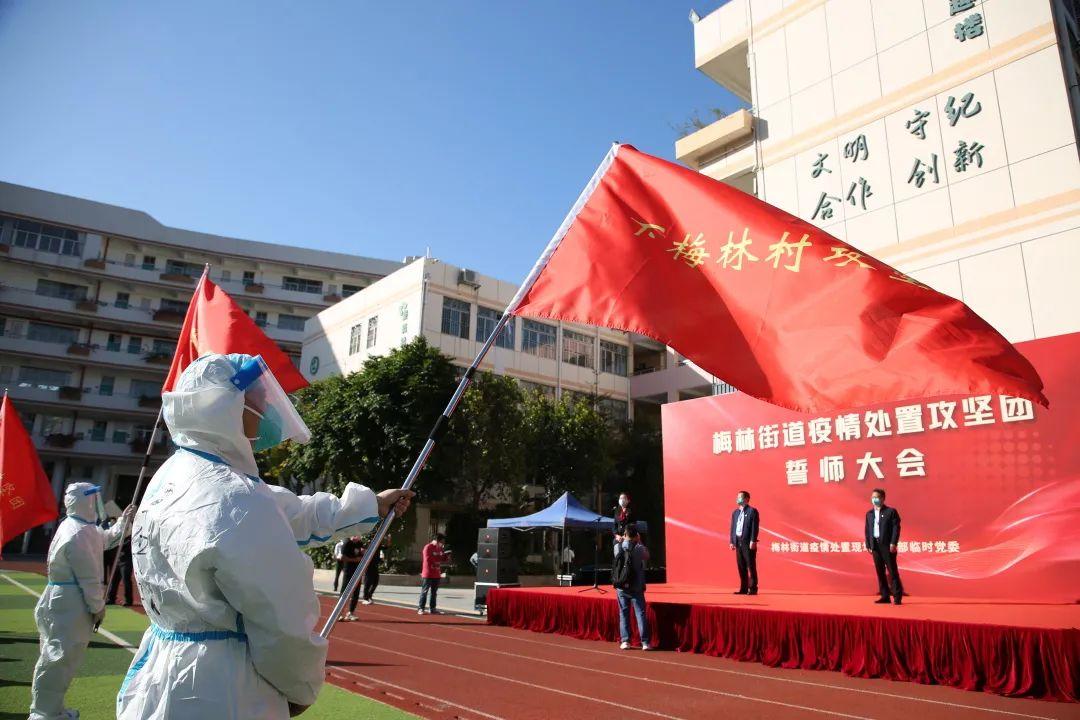 3月9日上午,梅林街道疫情处置攻坚团誓师大会在梅林小学举行,以宣誓、授旗的形式,号召全体党员干部和志愿者发挥先锋模范作用,以坚定的信念和昂扬的斗志投身到疫情防控阻击战中来。区委常委、统战部部长吴欢,区政协党组成员、副书记徐开军,区人大党组成员杨建汉出席活动并为三个攻坚团授旗。梅林街道党工委副书记、办事处主任刘慕军主持仪式。