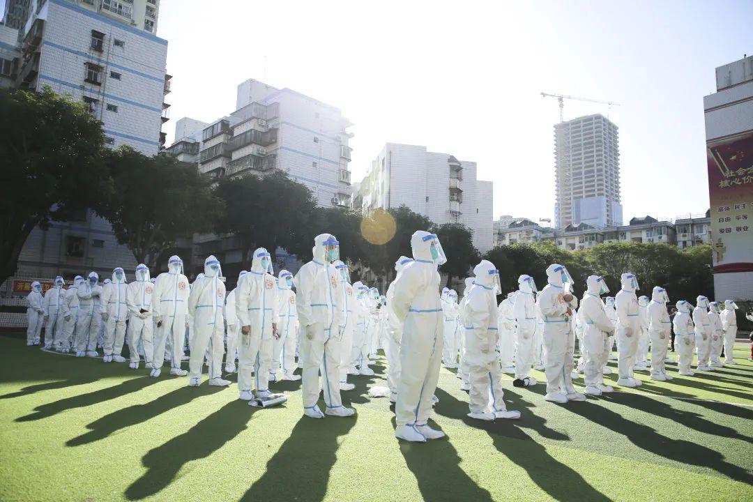 梅林街道疫情处置攻坚团由37名梅林街道党员干部、59名医护人员、181名各部门各单位抽调的防疫工作者及18名自发报名的爱心志愿者组成,他们即将奔赴疫情防控一线,却没有一丝犹豫,没有分毫退缩,用坚毅和大爱彰显了福田人的情怀和担当。