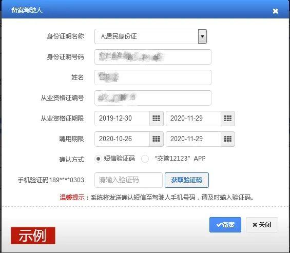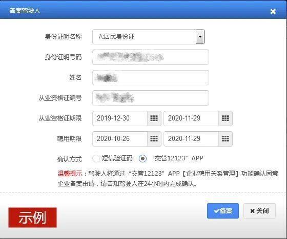 企业完成驾驶人信息录入后,驾驶人可通过绑定的手机短信或者交管“12123”手机APP进行确认,完成与企业人车的备案流程。