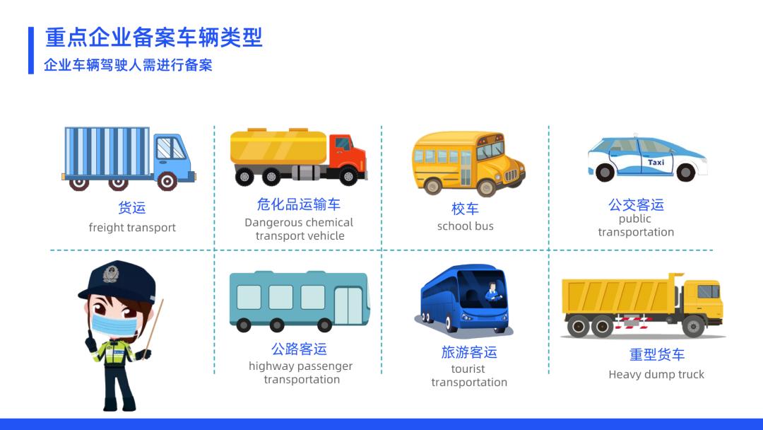 重点企业是指:企业名下存在旅游客运、公路客运、危险品运输、公交客运、校车及重型货车的企业。这些企业所运营的重点车辆需与驾驶人进行备案,及时跟进企业名下车辆绑定的驾驶人信息审验有效期及驾驶证状态等管理工作。