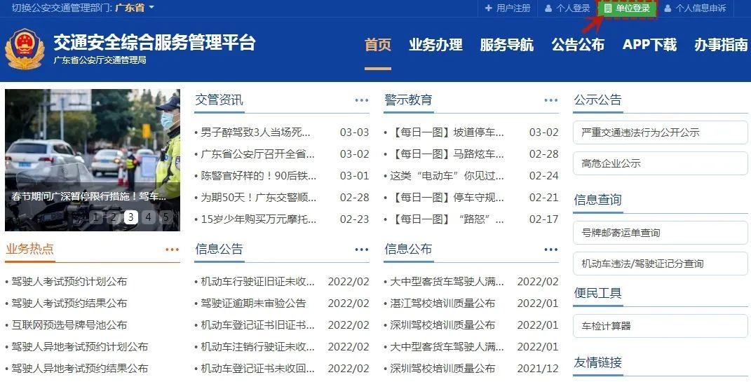 企业需要打开平台网页:交通安全综合服务管理平台的网址:https://gd.122.gov.cn/views/notice.html ,点击右上角的单位登录。