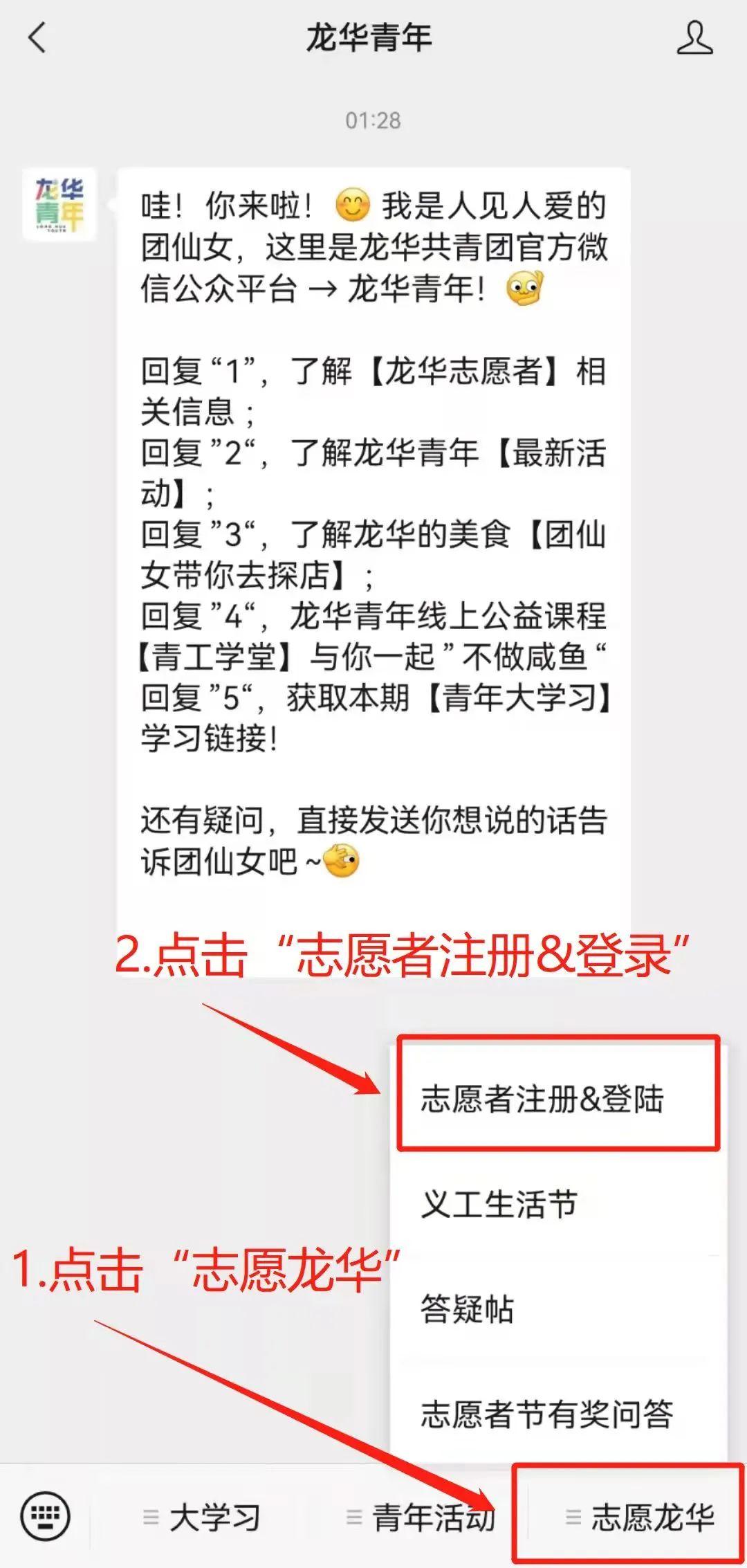 关注“龙华青年”公众号→进入公众号,点击右下角“志愿龙华”→点击“志愿者注册&登录”→填写姓名、身份证号码以及手机号即可,如图所示: