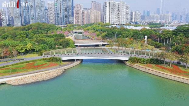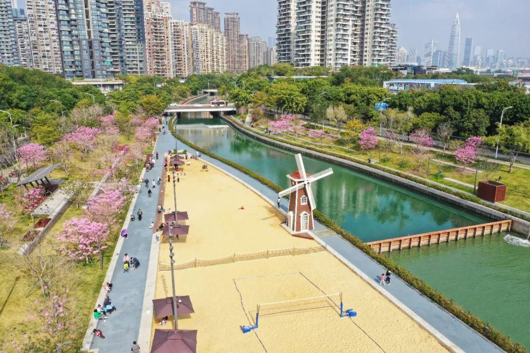 中心河提升工程一期在去年国庆期间正式对外开放,全长1.1公里,与深圳湾公园和滨海休闲带西段无缝相连。设置有慢跑道、沙滩池、智能设施等等,是深圳新晋的休闲娱乐圣地。