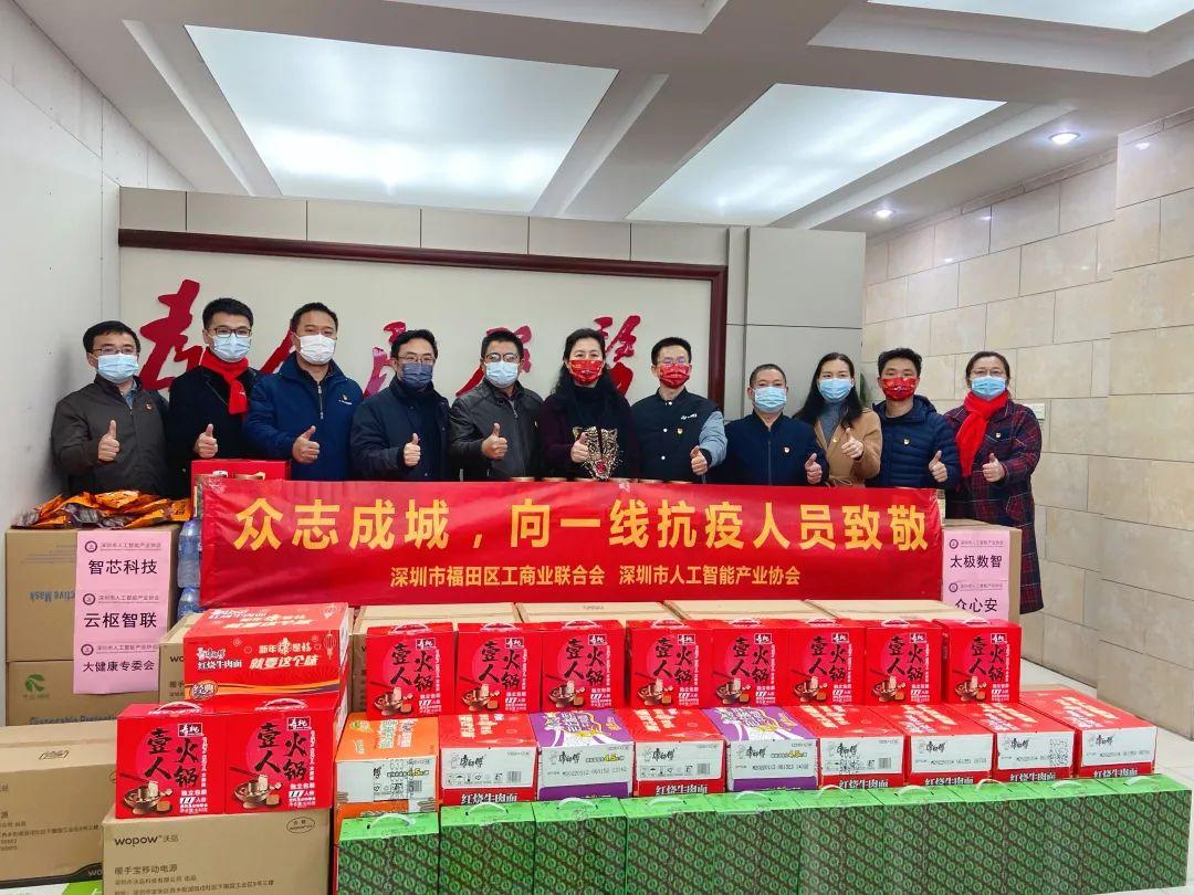 南山区数字经济产业协会与太极数智、智芯智能、云枢智联、众心安科技、大健康专委会、菱亚能源科技等一行筹集大批物资,慰问抗疫人员,为奋战在一线的工作者以及被隔离的群众送上暖手宝、姜茶、自热火锅等防寒慰问品。