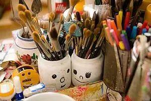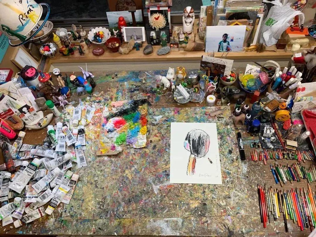 荒井良二工作室的桌子上紧密摆放着各种绘画工具