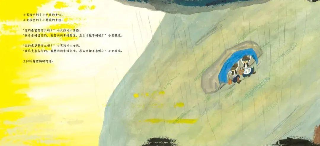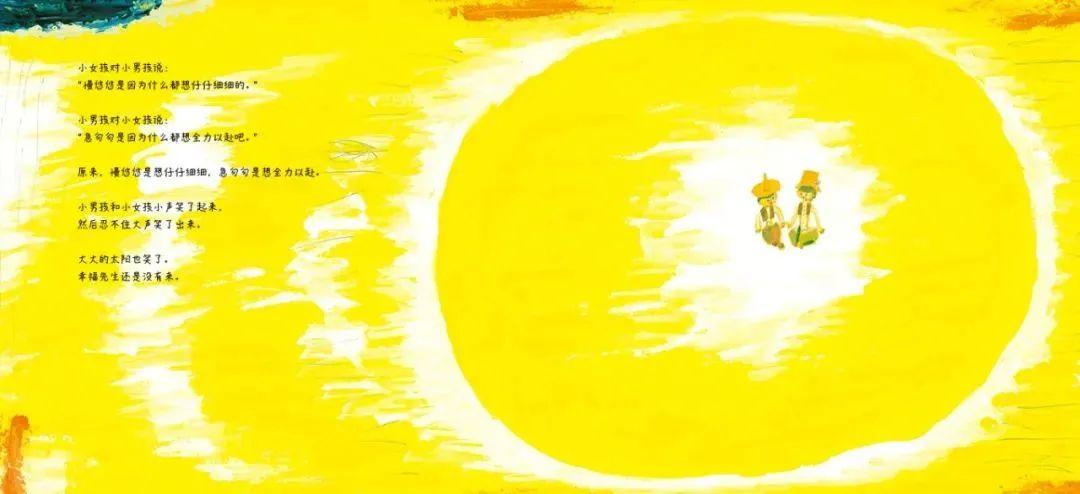小男孩和小女孩哈哈大笑起来,太阳听着她俩的对话。幸福先生能听到孩子们的愿望吗?至少此刻,他们是幸福快乐的。