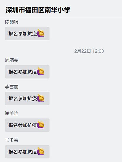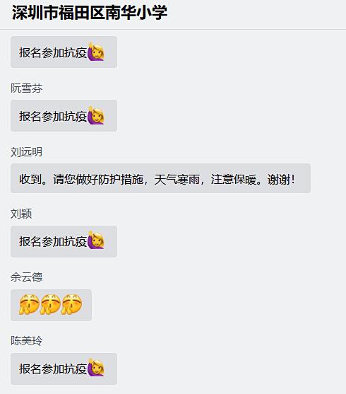 据统计,截至2月28日,南华小学教师申报参加防疫志愿活动已达65人。家校携手,齐心抗疫。让我们记住这些可爱的人,致敬这些平凡的英雄,是他们在这个寒冬守护了我们共同的家。在此,向每一位南华小学抗疫先锋成员致敬,感谢坚守的你们!