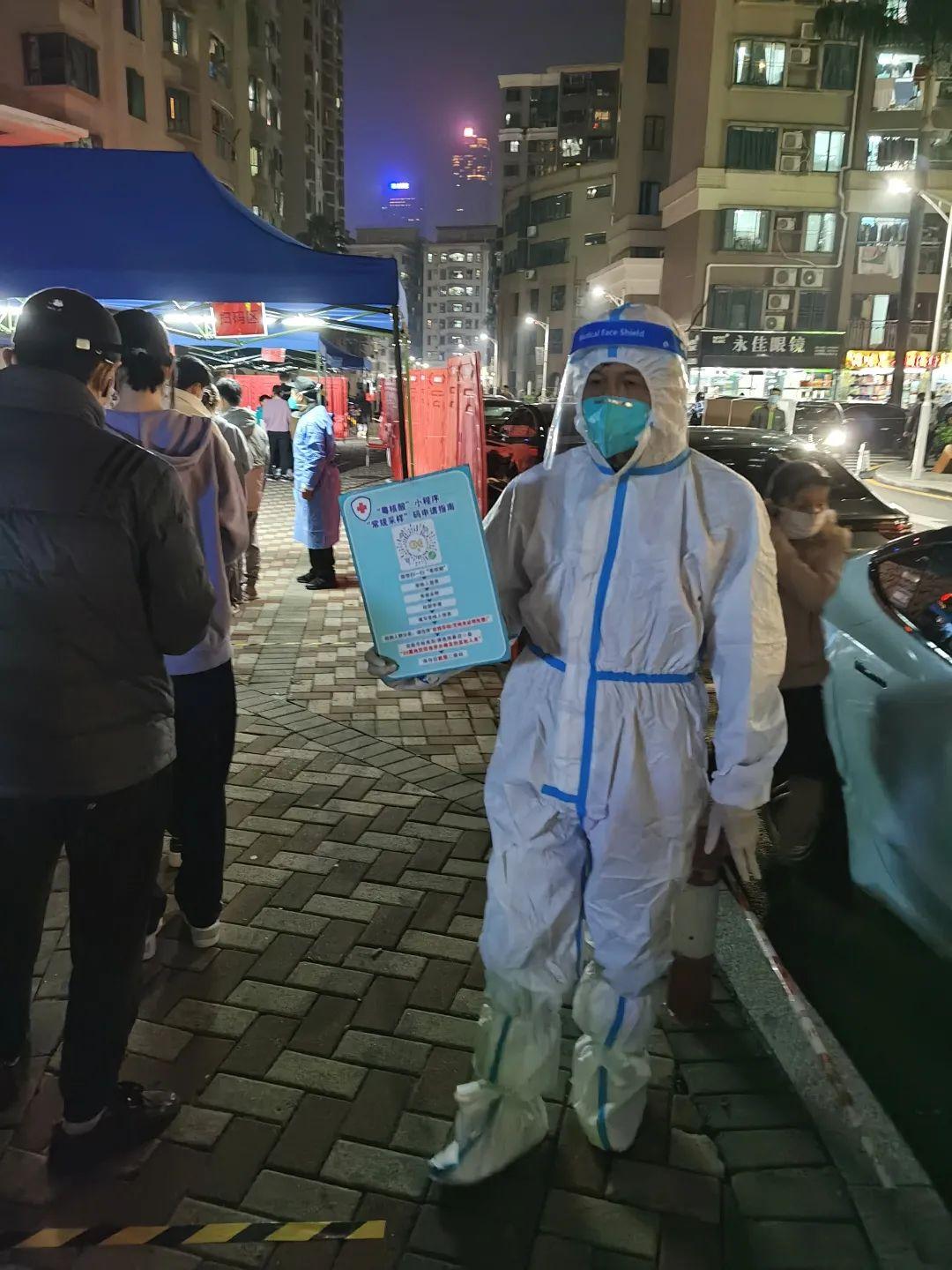 “‘我们不是生在和平年代,而是生在了和平的国家!’目前的防疫抗疫也一样,没有大家,哪有小家?为了确保市民安全和一方平安,田面社区党委在上级新冠肺炎疫情防控指挥部统一领导和指导下,政治站位高,经过周密部署,井然有序地做好各项防疫抗疫工作,所辖田面公司、民警、社康等都通力合作,同舟共济。南华小学位于田面社区,更应挺身而出,勇当志愿,共克时艰。做志愿者时,我切身体会到其中的辛苦。比如,穿上防护服时,捂出一身汗;深夜了,又很冷。”