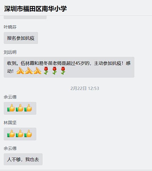 在这支队伍中,有身先士卒的校长,有高达56岁的资深教师、还有舍“小家”顾“大家”的家长……他们用实际行动为抗击疫情贡献自己的力量,诠释着父母、教师的责任与担当:资深的侯红霞、易东苗、周爱红老师在昏暗的灯光下,隔着面罩,对着密密麻麻的花名册,一个一个核对居民情况。5个小时下来,平时就血压高的易东苗老师,手脚发麻,头晕眼花;年轻的陈博老师,因为气喘一直没好,说话费劲,不停咳嗽,也仍然坚持上岗;伍林霞老师在服务核酸检测点,从下午4点一直站到晚上12点,连续8个小时,也不曾休息;陈丽娟、刘洋、侯红霞、易东苗、伍林霞、李景萍、陈博老师为了尽量避免坐公交感染的危险,选择了打的士到岗。副校长林国坚和教师梁燕清夫妻比翼齐飞,双双参加抗疫,成为田面社区抗疫志愿典型的夫妻档。学校校长余云德时刻记挂着志愿同事们,在支援工作中,常常干完活已晚上12点,仍然坚持送几位志愿者回家,当他回到家时,已经是凌晨一点多了,第二天白天接着处理全校的在线教学、防疫抗疫和学校管理事务,晚上继续抗疫……