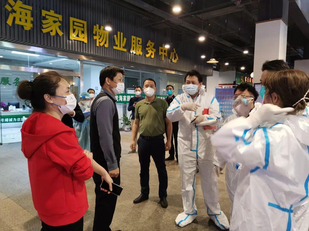 集团党委书记、董事长郭军现场向局领导汇报该区域现场防疫工作安排情况,集团下午抽调首批30名员工参与龙海家园南区、前海时代疫情防控工作,实施逐户、逐楼扫码核查及配合核酸采样等工作。