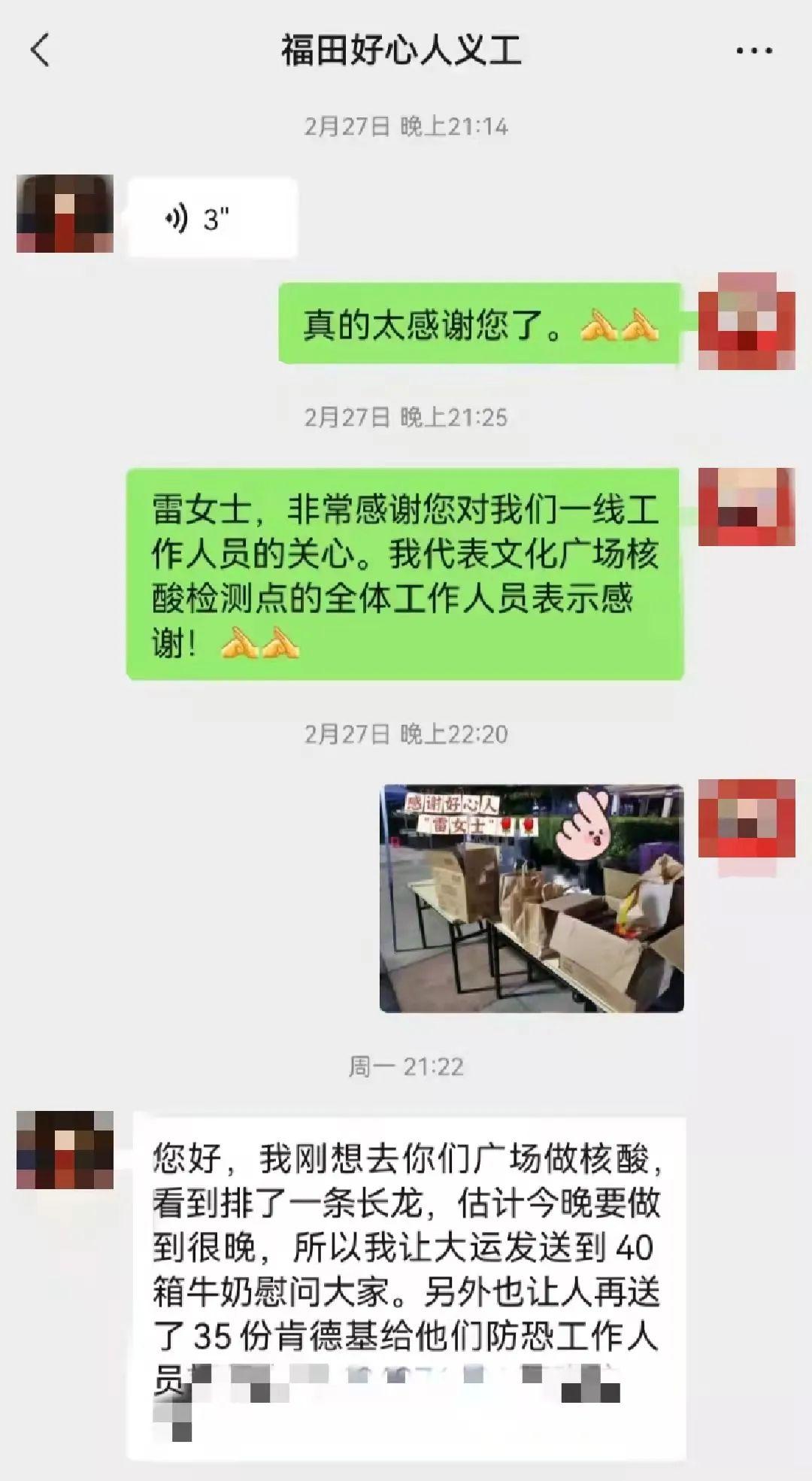 “她有一次路过龙华文化广场,看到核酸采样点排着长长的队伍,觉得现场工作人员特别辛苦,就派人送了40箱牛奶表示慰问,另外还让人送了35份肯德基快餐给安保工作人员。”吴文莉还提到,虽然每次送过来的物资都是署名“福田义工”,但大家都称她为“福田好心人”。