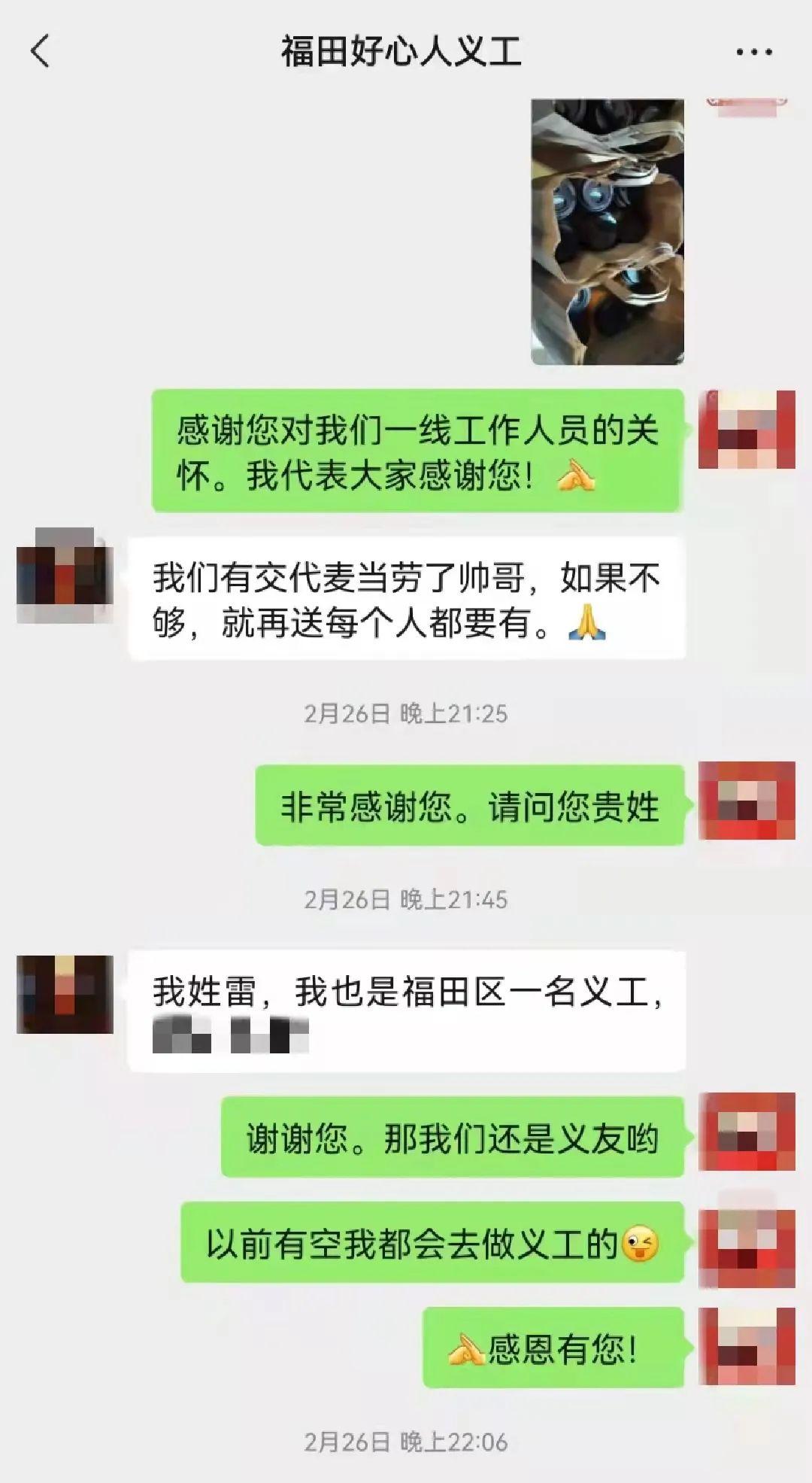 龙华街道工作人员吴文莉回忆道,“第一批物资是一名快递小哥送过来的,而我刚好在龙华文化广场核酸采样点工作,快递小哥便直接找到了我,并给我推了她的微信。我添加她为微信好友后,她向我询问了一些关于疫情的事情,同时表达了对现场一线工作人员的关心。此后,她又多次送来物资。”
