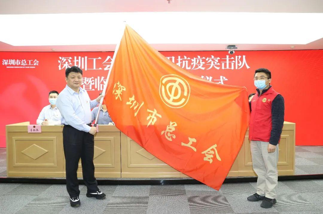 深圳市总工会党组书记、常务副主席李映中出席仪式,并为深圳工会支援福田抗疫突击队暨临时党支部授旗,市总工会党组成员、副主席冯艳玲主持仪式。