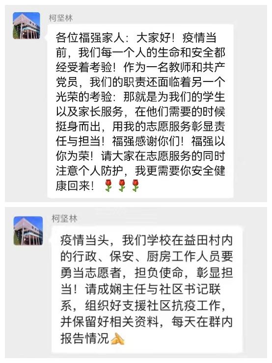 在这场“战争“中,福强志愿者队伍一直在线。管控区内,60名“战士”随时待命;管控区外,有23名“勇士”整装待发。他们中还有更多老师,虽然要上网课,但是他们争分夺秒,见缝插针地加入到志愿活动中来。
