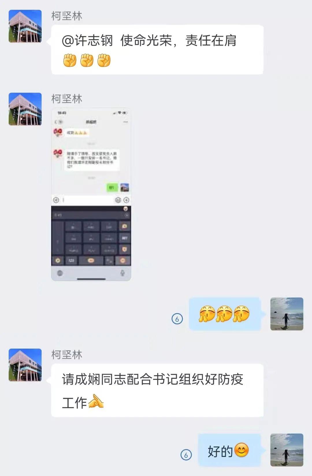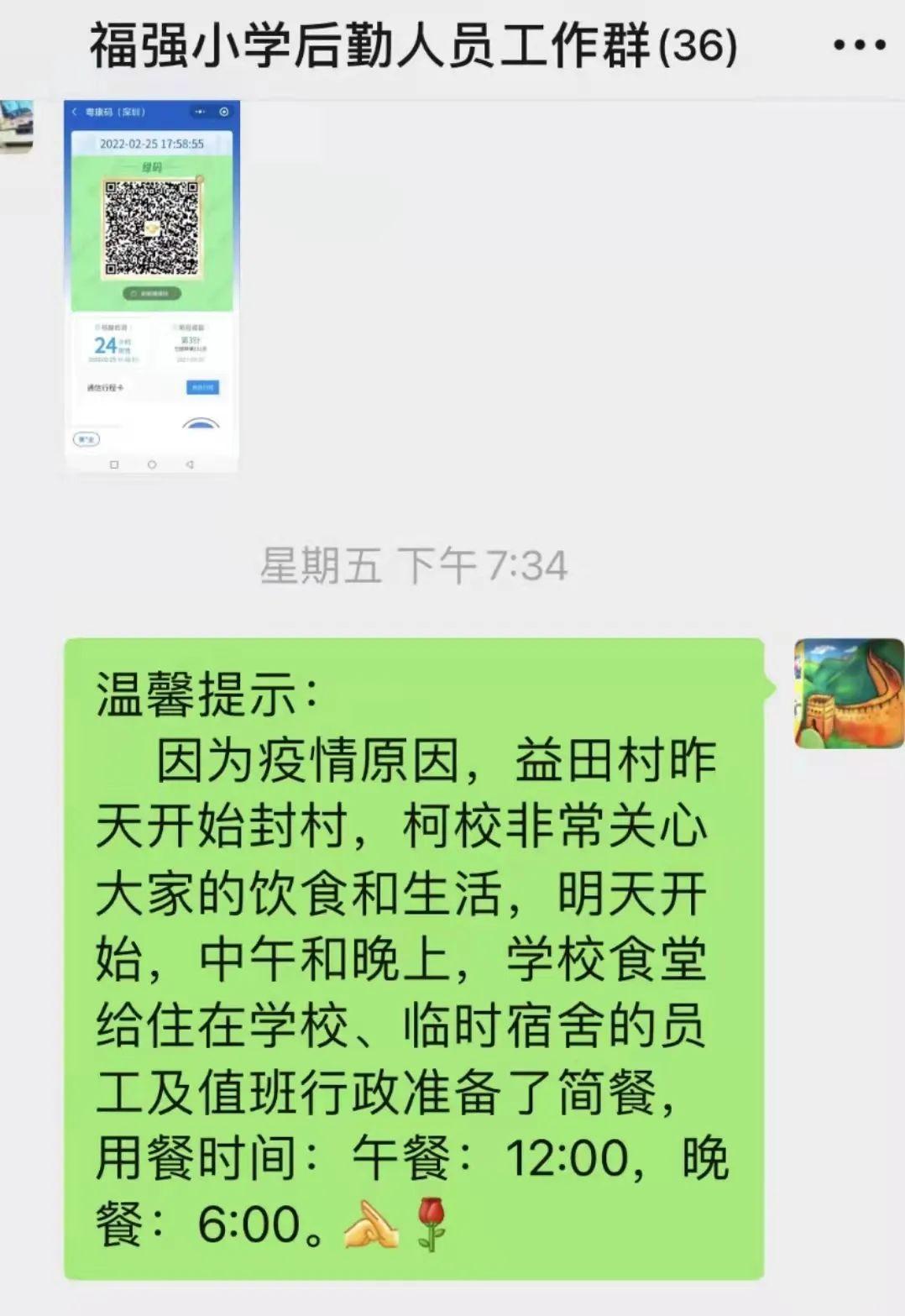 2月24日,益田村升级为管控区。在这个艰难的时刻,学校管控区内的教职工在校长柯坚林的关怀和倡导下,在副校长许志钢的带领下团结起来,组建了一支益田村内的志愿者队伍,主动与益田村社区对接,了解需求、配合服务,作为志愿储备军,随时待命,配合社区做好防疫工作。同时,学校后勤部门则做好后勤支持工作,让志愿者们无后顾之忧。