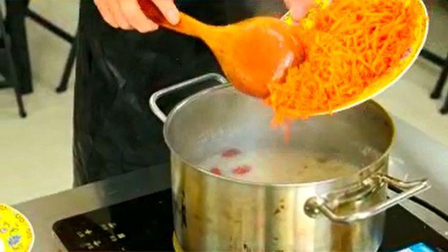 4.放入胡萝卜,加半勺油使胡萝卜素更好吸收,中火煮10分钟。出现金黄色油状时即可关火,盛出食用。