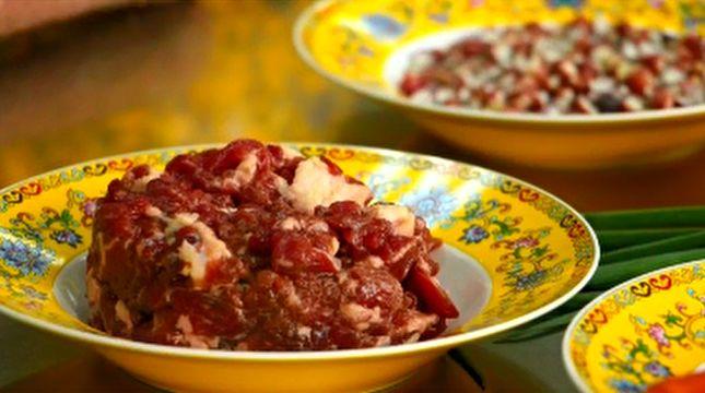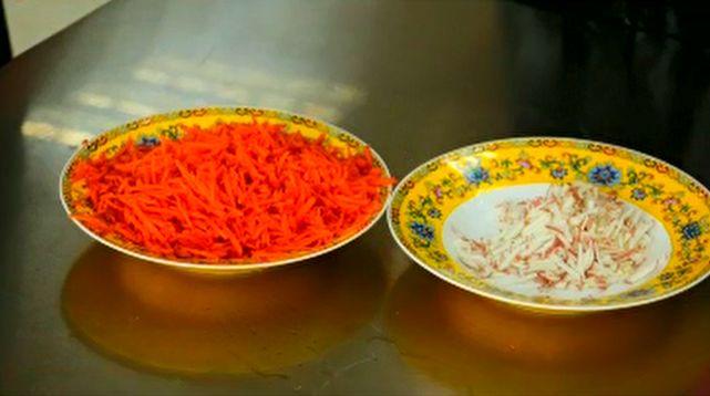 1.牛肉提前1小时用料酒和生抽腌制好,胡萝卜和淮山刮成丝。