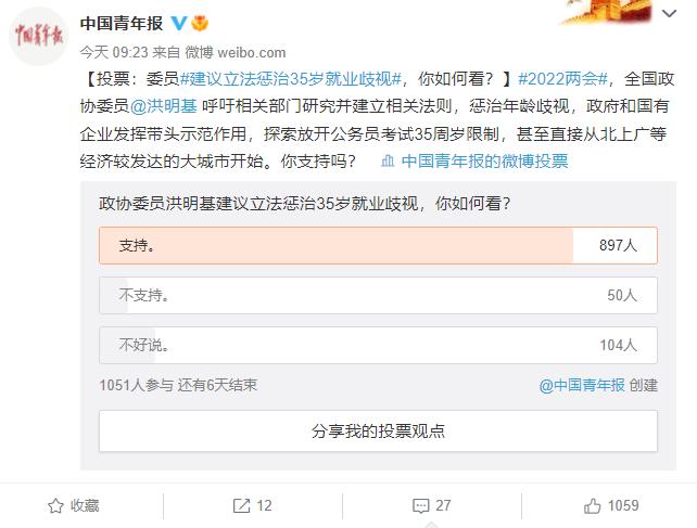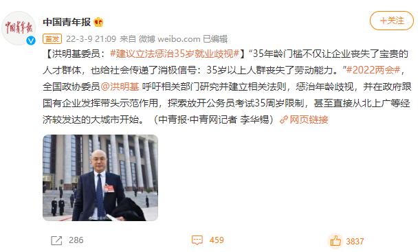今年两会,全国政协委员、合兴集团控股有限公司执行董事兼行政总裁洪明基呼吁相关部门通过立法方式惩治“35岁”就业歧视。