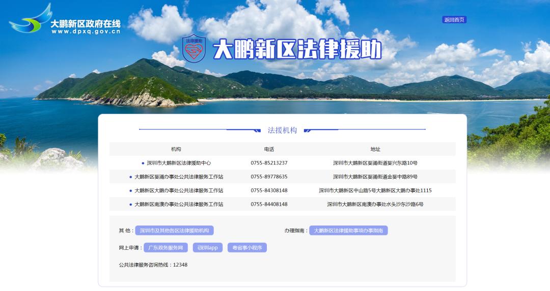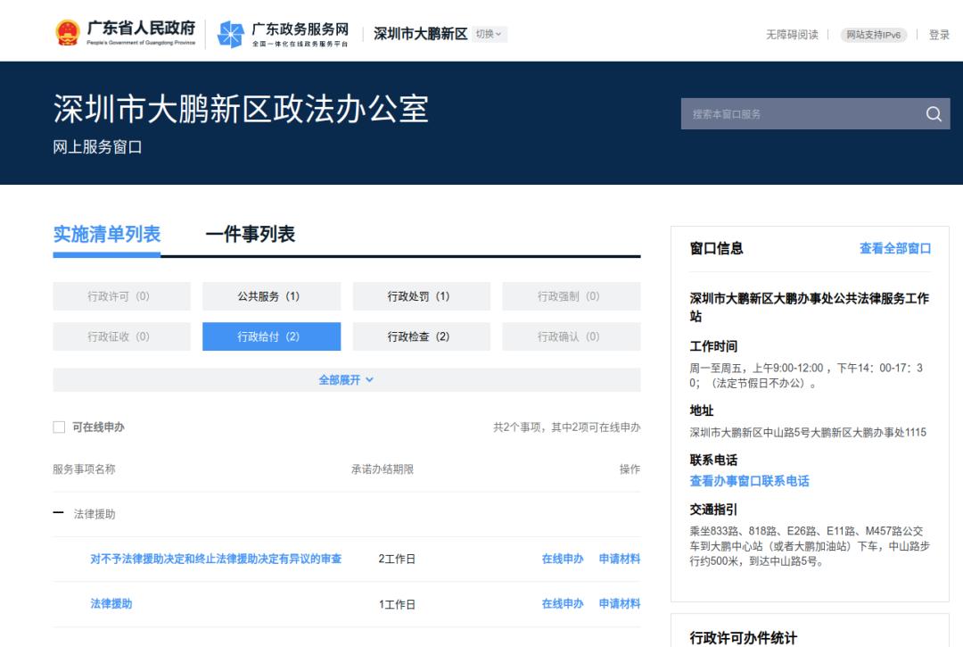 强化法律援助业务标准化建设,新区政法办公室通过广东政务服务网公开业务受理标准、办理流程、申请材料等信息,办事人可线上直接申办业务,实现业务办理阳光化、规范化。并开设法律援助线下办事窗口,大鹏新区公共法律服务中心、葵涌办事处公共法律服务工作站、大鹏办事处公共法律服务工作站、南澳办事处公共法律服务工作站等均可咨询办理法律援助各项业务。