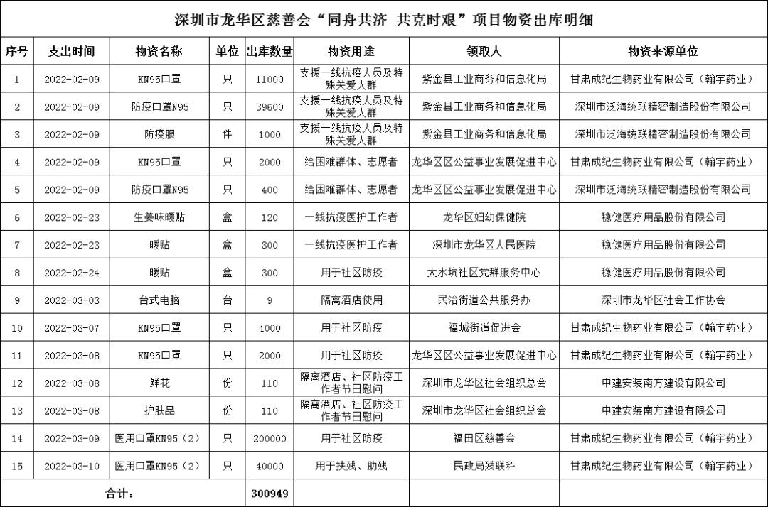 2022年2月1日至3月10日,深圳市龙华区慈善会共接收社会各界关于“同舟共济 共克时艰”项目捐赠款物共1081849件,价值704599元,支出共300949件,价值479369元。共接收捐赠资金857840元。