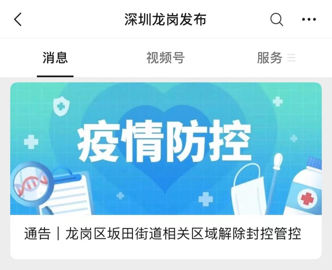 根据疫情处置进展,经研究决定,自2022年3月11日21时起,龙岗区坂田街道解封相关封控区、管控区、防范区,现通告如下: