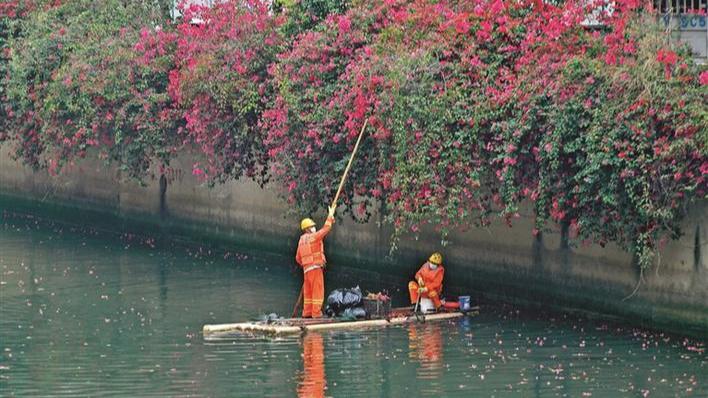 ● 进入3月,西乡河畔的簕杜鹃进入了盛放期,宝安排水公司西乡分公司的工作人员在河面上进行清理作业,鲜艳的工作服与沿河的簕杜鹃形成一道美丽的风景线。