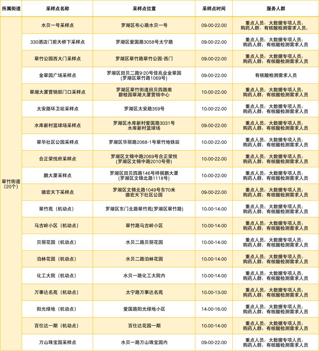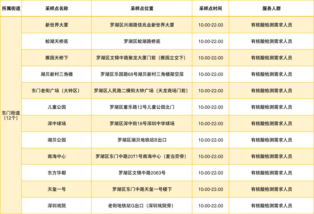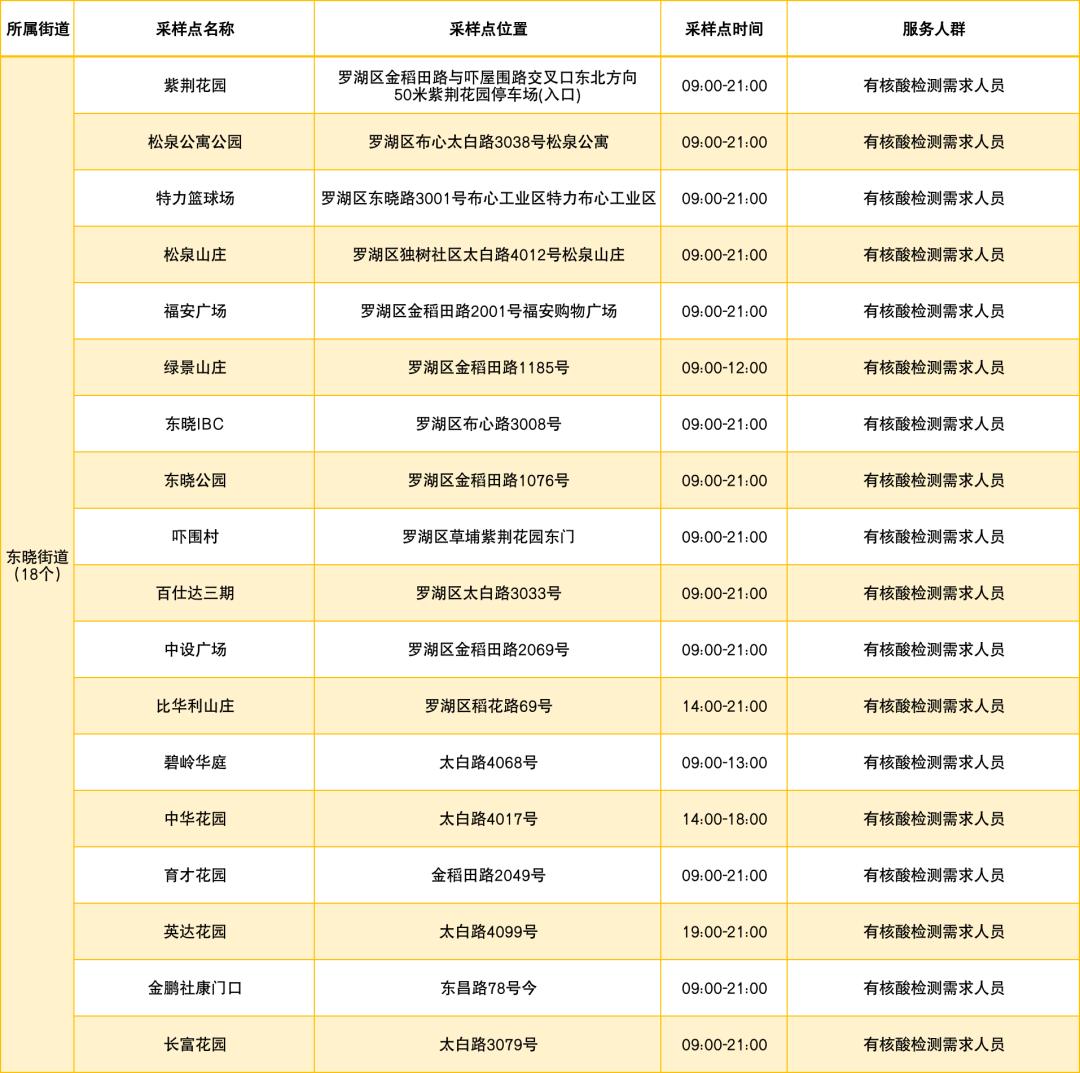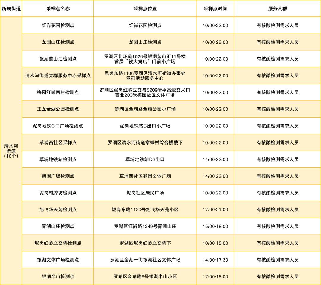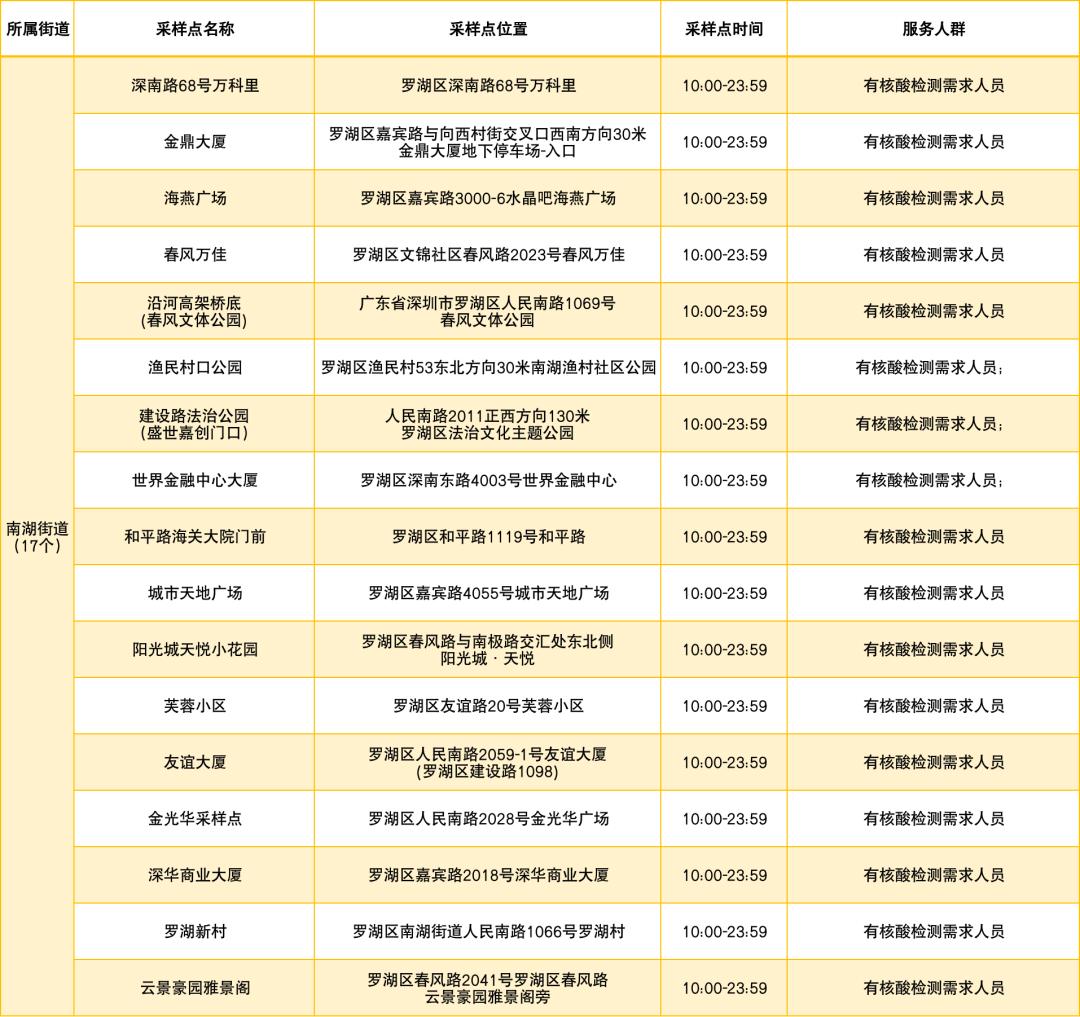 罗湖区设置了以下免费核酸采样点