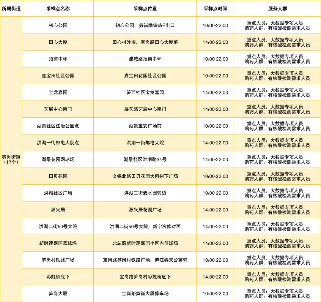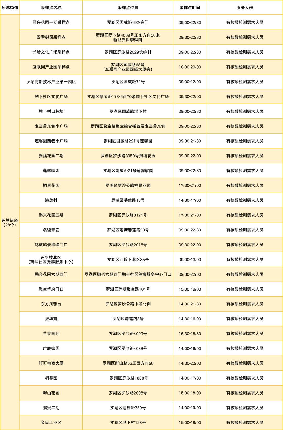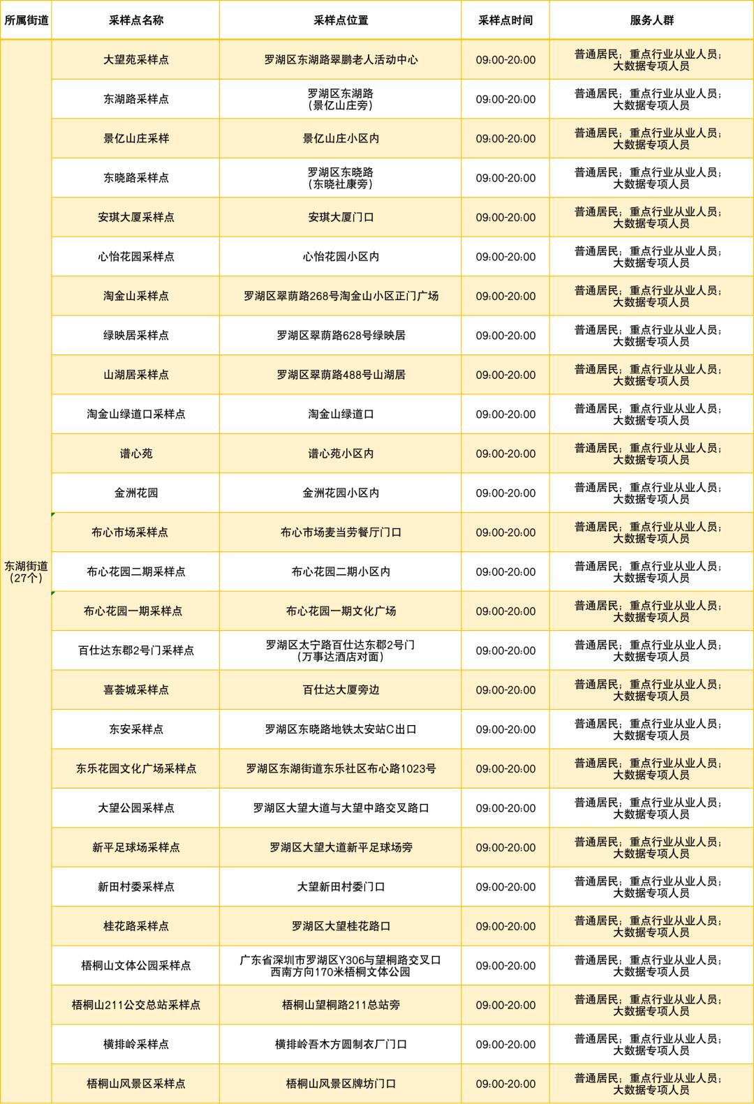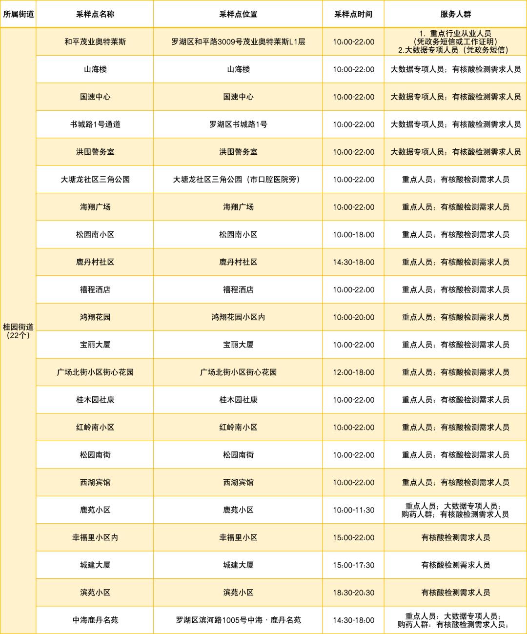 罗湖区设置了以下免费核酸采样点
