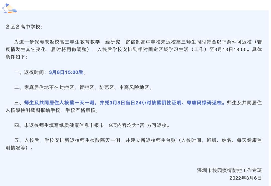 近日,深圳市疫情防控工作专班发布通知,寄宿制高中学校未返校高三师生同时符合有关条件可返校,返校时间为3月8日15:00后,入校后学校安排到相对固定区域学习生活(工作)至3月13日18:00。更多»